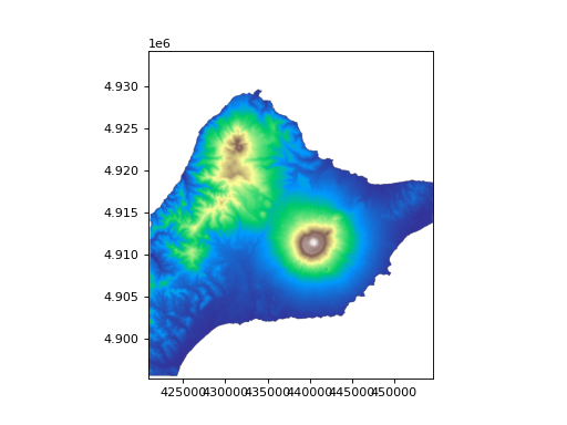 >>> import topotoolbox >>> import matplotlib.pyplot as plt >>> from rasterio import CRS >>> dem = topotoolbox.load_dem('kunashiri') >>> dem = dem.reproject(CRS.from_epsg(32655), resolution = 30) >>> _= dem.plot(cmap="terrain") >>> plt.show()