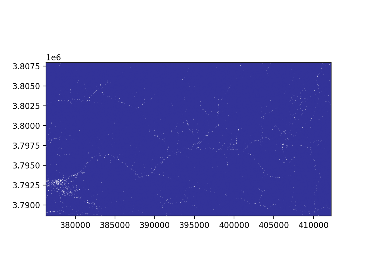 >>> import topotoolbox >>> import matplotlib.pyplot as plt >>> dem = topotoolbox.load_dem('bigtujunga') >>> flats, sills = dem.identifyflats() >>> _= flats.plot(cmap='terrain') >>> plt.show()