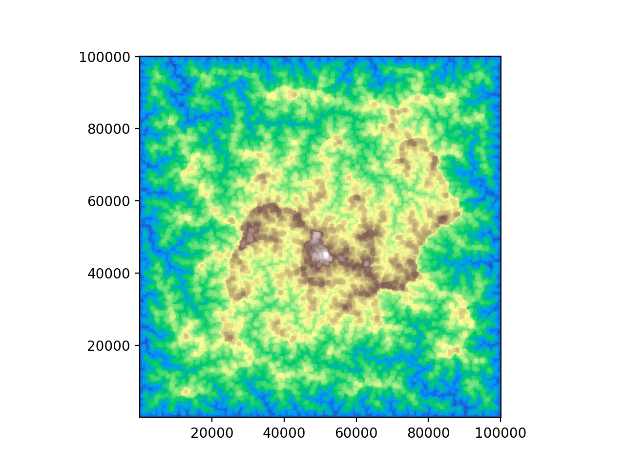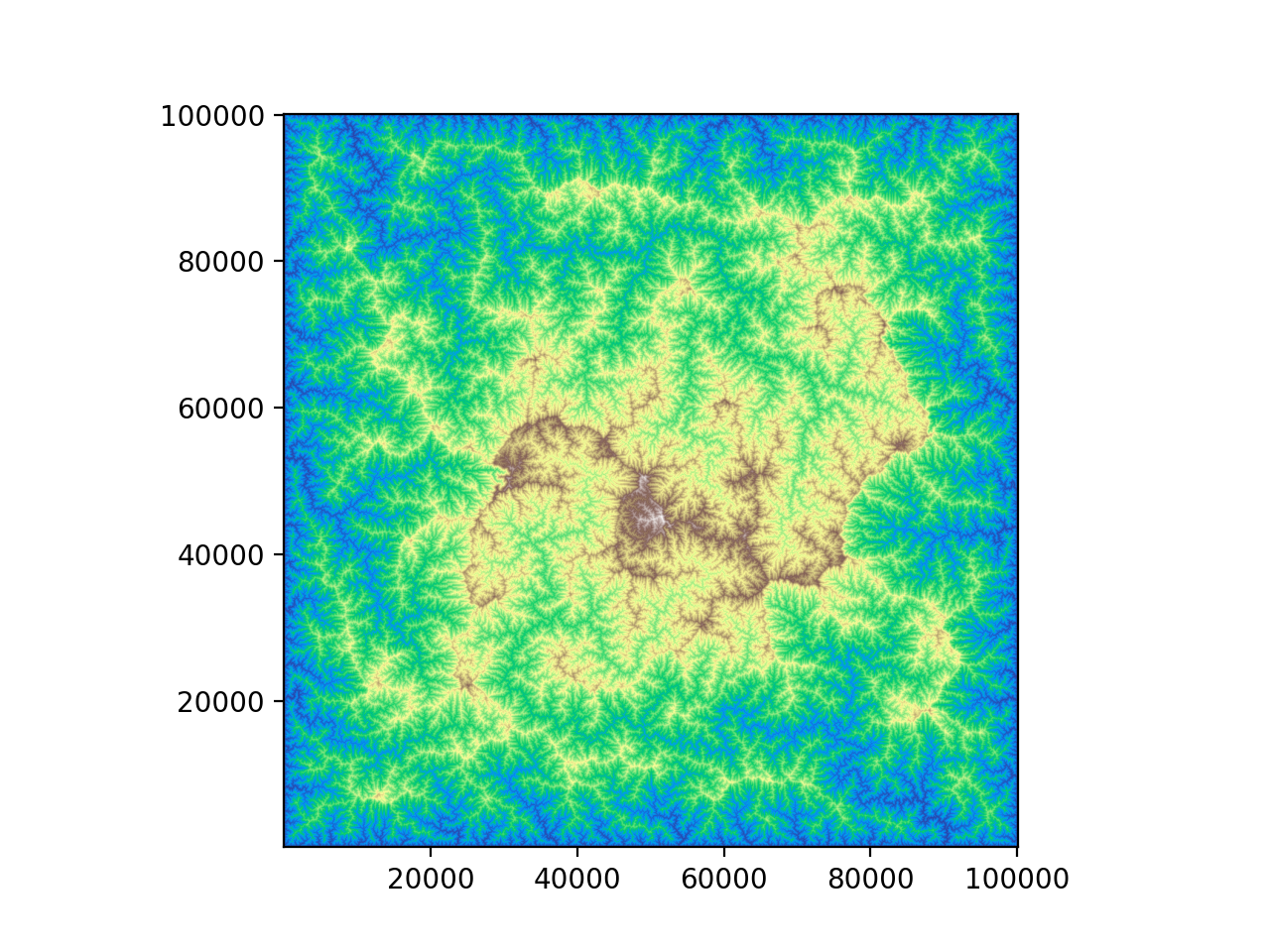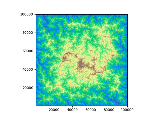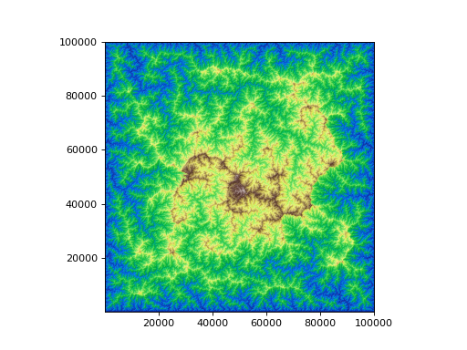 >>> import topotoolbox >>> import matplotlib.pyplot as plt >>> dem = topotoolbox.load_dem('perfectworld') >>> filled_dem = dem.fillsinks() >>> _= filled_dem.plot(cmap='terrain') >>> plt.show()