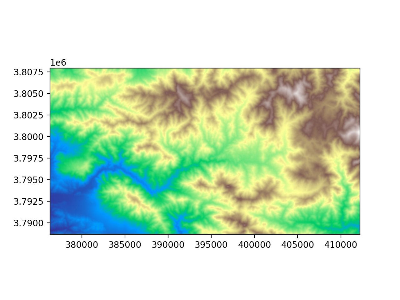 >>> import topotoolbox >>> dem = topotoolbox.load_dem('bigtujunga') >>> dem_90m = dem.resample(resolution=90) >>> im = dem_90m.plot(cmap="terrain") >>> plt.show()