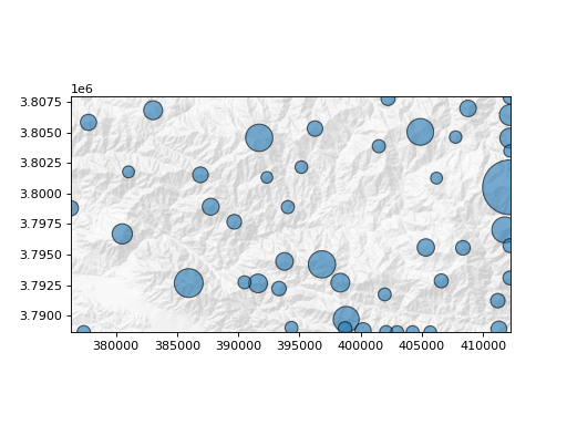 >>> import topotoolbox >>> import matplotlib.pyplot as plt >>> from matplotlib.colors import ListedColormap >>> dem = topotoolbox.load_dem('bigtujunga') >>> prom, (x, y) = dem.prominence(tolerance=90) >>> _ = plt.subplot() >>> _ = dem.plot_hs(cmap=ListedColormap([0.9, 0.9, 0.9]), exaggerate=3) >>> _ = plt.scatter(x, y, prom, alpha=0.6, edgecolor='black') >>> plt.show()
