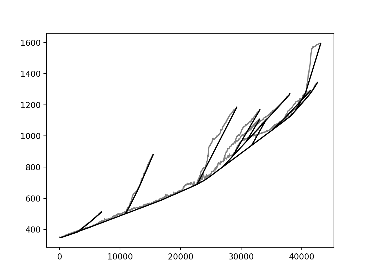 >>> import topotoolbox >>> import numpy as np >>> import matplotlib.pyplot as plt >>> dem = topotoolbox.load_dem('bigtujunga') >>> fd = topotoolbox.FlowObject(dem) >>> s = topotoolbox.StreamObject(fd) >>> s = s.klargestconncomps(1) >>> z = topotoolbox.imposemin(s, dem) >>> kn = np.zeros(len(z), dtype=bool) >>> ze = s.lowerenv(z, kn) >>> fig,ax = plt.subplots() >>> _= s.plotdz(dem, ax=ax, color='gray') >>> _= s.plotdz(ze, ax=ax, color='black') >>> ax.autoscale_view() >>> plt.show()