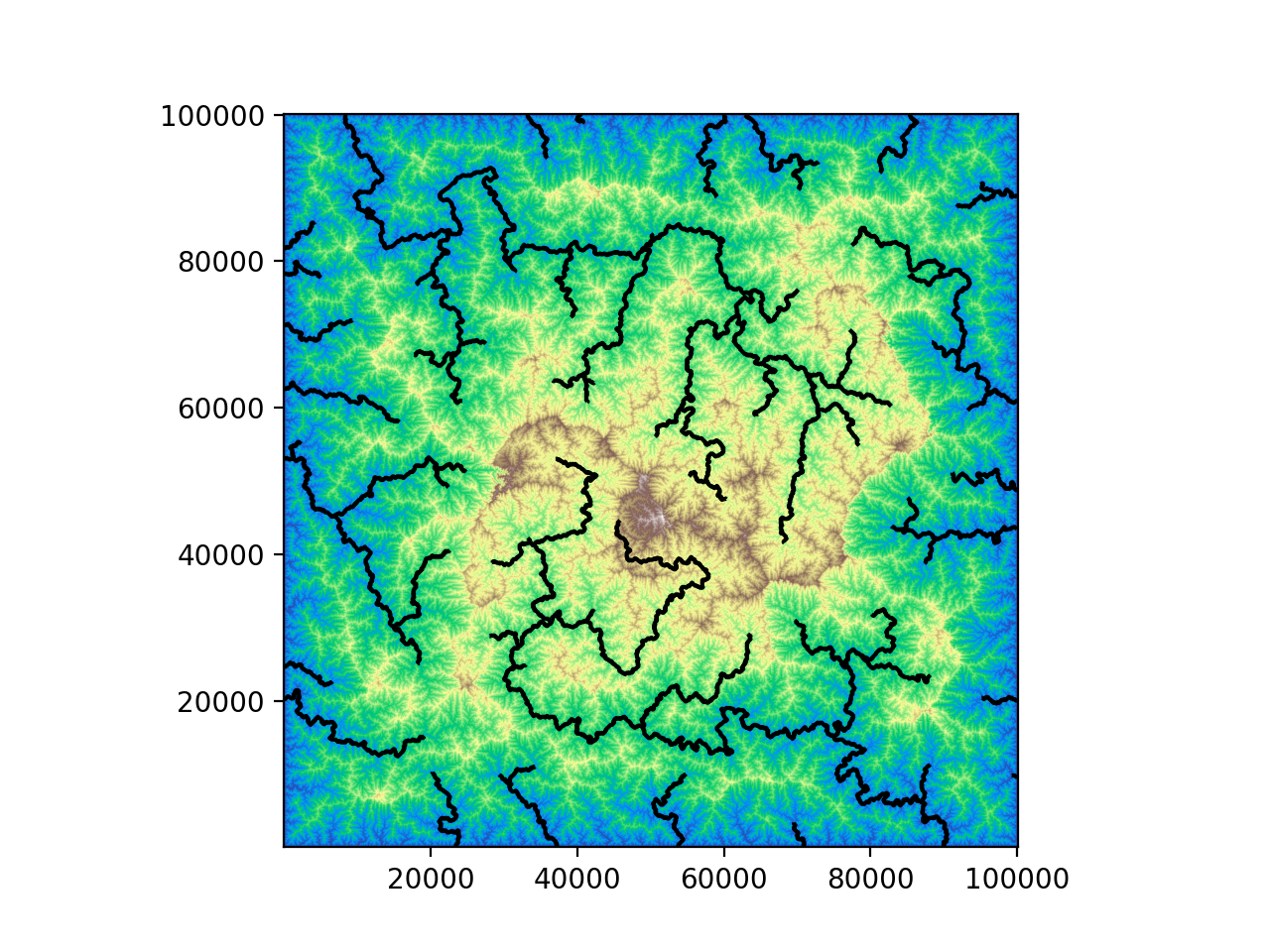 >>> import topotoolbox >>> import numpy as np >>> import matplotlib.pyplot as plt >>> dem = topotoolbox.load_dem('perfectworld') >>> dem = topotoolbox.load_dem('perfectworld') >>> fd = topotoolbox.FlowObject(dem) >>> s = topotoolbox.StreamObject(fd,threshold=1000,units='pixels') >>> shape = dem.shape >>> arr = (np.arange(np.prod(shape))<np.prod(shape)//4).reshape(shape) >>> s2 = s.subgraph(arr) >>> fig,ax = plt.subplots() >>> _= dem.plot(ax=ax,cmap="terrain") >>> _= s2.plot(ax=ax,color='k') >>> plt.show()